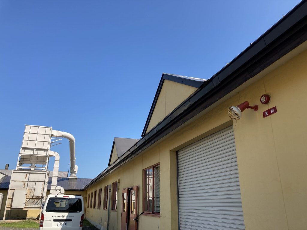 今朝は、雲一つない木曜日の朝を迎えています。今朝は、工房の裏手側から写して見ました。右手の白い壁の建物は第二工房です。数年前に買い取った建物ですが、外壁の塗装が追い付いていません。平成43年に㈿旭川木工センターが形成された当時の建物で、55年経過しています。スタートは建具製造メーカーでしたが、後に廃業し組合が管理していたところをコサインが賃貸で24年前にお借りし、その後買い取りました。購入した当時の工場の中は事務所、休憩室など仕切られていたので、一旦工場内を全てを撤去し、仕切り直しました。毎年状況に応じて設備投資を行いながら維持しています。 窓辺に蒔いた朝顔をツルを伸ばして来ています。