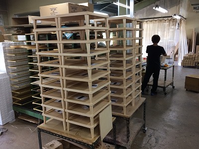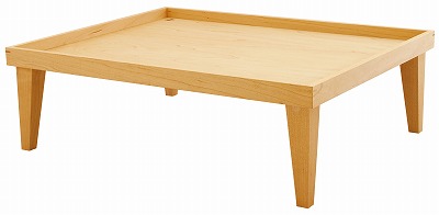 工房では、日々カタログに掲載されている製品が仕上がって来ますが、中には数量のまとまった特注製品の依頼も受けて居ます。積み上げられている製品は、カタログに載せていない、今は生産を終了している製品を発注頂きました。製品名は「お月見トレー」です。一人膳で、床やベットの上などで使用できるトレーです。積み上げて収納する事も出来ます。良く見る料亭の御膳ですね。