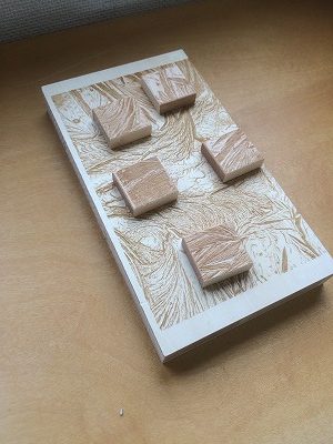 日課として、スマホカメラで写真を写しながら、工房を一周し外回りをし、事務所に戻って来ます。その間に気になる事があれば写真を写したり、社員に話しかけたりしています。最近は、製品を作る際に出る形の揃った短材が気になり、形(生活道具)に出来ないかと夜な夜な挑戦しています。今回は、美瑛町で活躍する陶芸家「皆空窯」南正剛氏の氷裂模様を木に生かせないかと数年前より取り組んで来ている時のサンプル材がもったいないので、細かくして、マグネットを作って見ました。