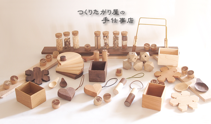 【つくりたがり屋の手仕事店】コサインの工房で製品を作るのに満たないサイズの小さな材料を使って、ものづくりが大好きなコサインのスタッフがそれぞれデザインし、作り上げました。木のぬくもりと手作りのやさしさを感じる木の小物ばかりですので、どうぞ身近に置いてお愉しみください。売上の一部は「コサインの森」の運営費として活用されます。今年は、私も参加しました。製品を作る際に切り落された木っ端を中心に皆様の生活道具とりて、お役に立てることを願って、作って見ました。商品は、直営店であるコサイン旭川本店、コサイン札幌、コサイン青山、コサインKids、コサイン公式通販サイトのみで販売しています。