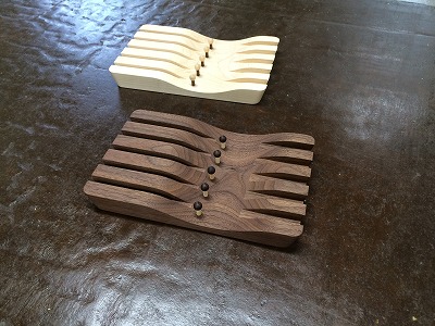 写真の波をうったベースに溝が付かれた商品は、規格化され機械で作られたものではなく、一丁一丁を鋼から手で削りだし丁寧に仕上げられた“ふぞろい”だけど“温もり”を感じ、使い込むほどに愛着のわくハサミを、何世代にも渡り職人から職人へ引き継がれてきた伝統、情熱、プライド、技能を忘れることなく製品をつくり続けているミズタニシザーズさんオリジナルスタンドです。