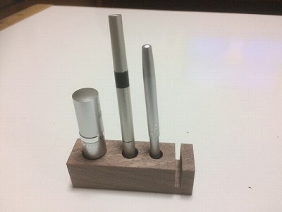 先日、製品を作る際に出る短材でスタンドを、直営店にお立ち寄り頂いた方に、緊急事態宣言が解け、会えて「良かったね!」プレゼントとをさせていただいて居ます。自分では、シャチハタ&ペン&マーカー&ポストイットと想定し穴の大きさ順に、溝を付けました。先日差し上げた方より、お化粧道具を整理するのに使って居ると聞き、妻の道具を立てて見ました。なるほどね~。発想すれば様々な使い方が考えられますね。燃料になるはずだった短材も長く大切に使える生活道具になりました。但し、Oちゃんからはデザインに課題ありと・・・。引き続き、短材活用して行きます。
