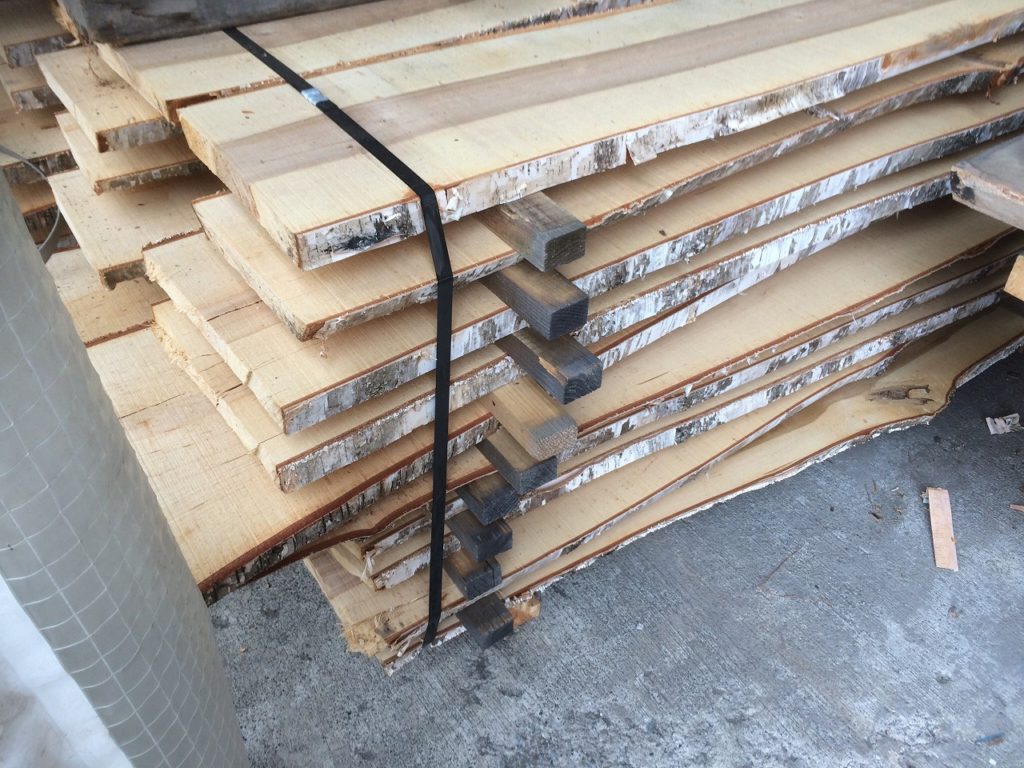 早朝、一雨降りました。今は雲が主役の空模様です。秋になり、街路樹で赤い実を付ける木があるのですが、名前はわかりません。その実を食べにカラスが群がっているんです。コサインの工房の周りも秋!って感じです。9月、社員研修としてコサインの森に行って来ましたが、その際に伐採した白樺の丸太が製材されて来ました。これから天然乾燥させます。何作ろか・・・。