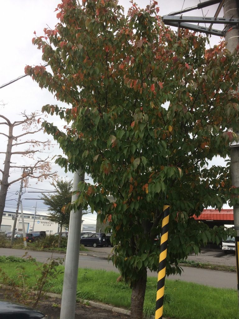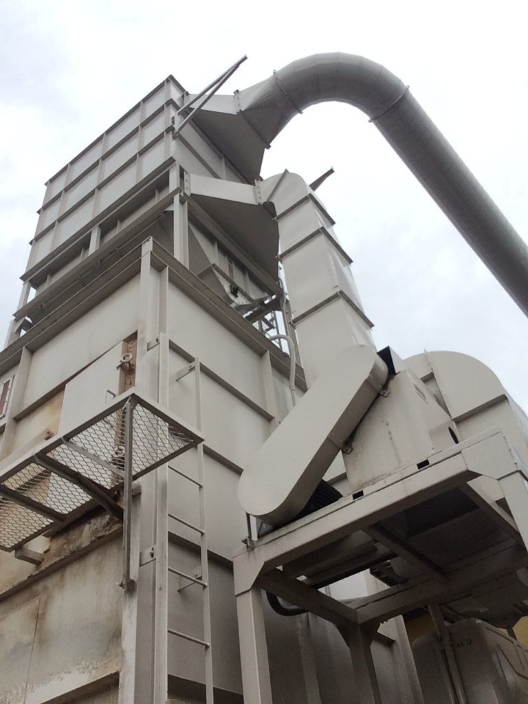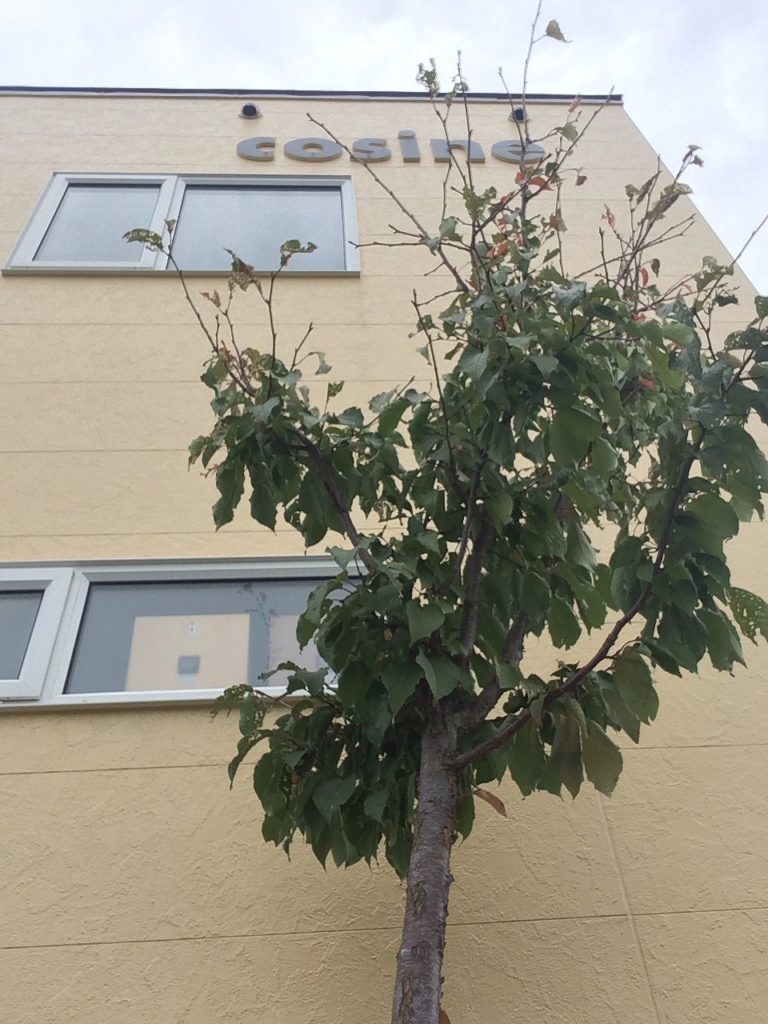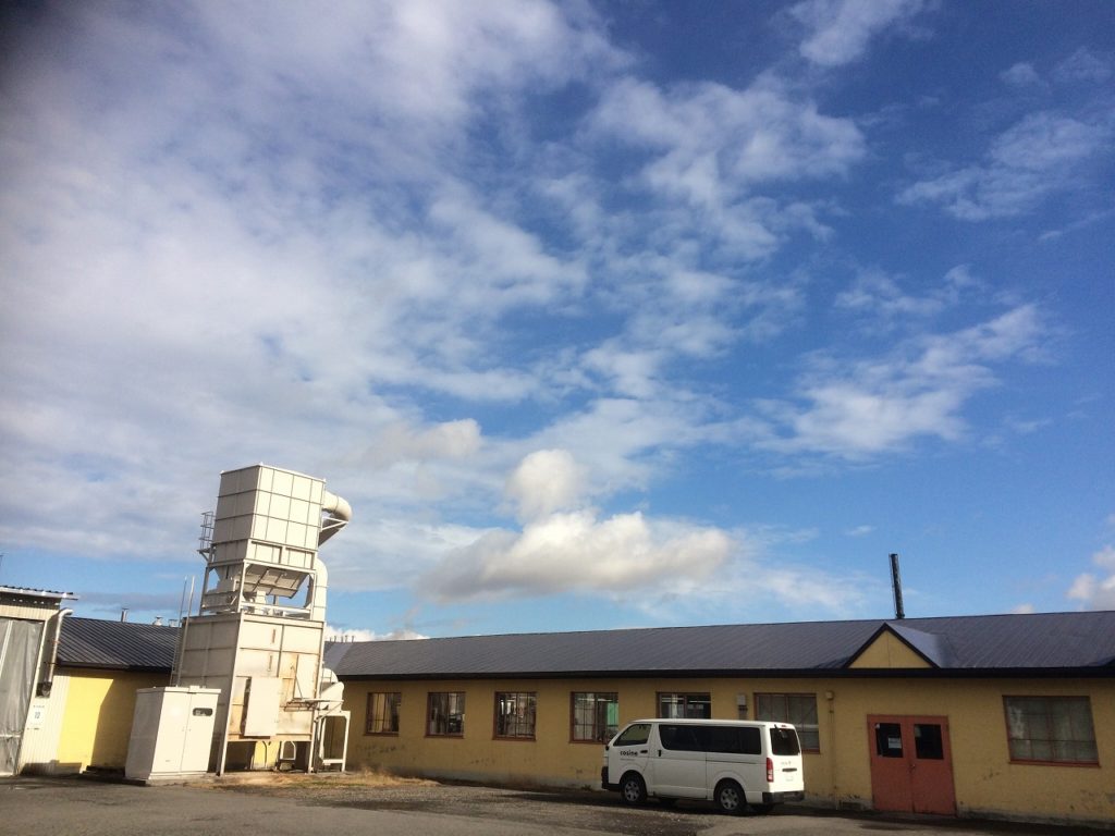 すっかり秋の空です。サクラの木も色付いて来ました。事務所側の桜の木の上部が虫に葉を食べられ枝がむき出しになっています。工房の脇にそびえ建つのは集塵装置です。要塞のような建物ですが、工房で製品を加工する時に機械から出るノコ屑を掃除機の仕組みでホースで吸い取りこの建物に集めます。集められたノコ屑は、一旦上の建物に吸い上げられ、空気とノコ屑と分離され、ノコ屑は下の建物に貯められます。空気は、工房に戻されます。特に冬場は工房の暖かい空気を戻すので、工房が暖かく保たれるのです。貯められたノコ屑は、定期的にトラックで回収に来ていただき、牛の敷き藁の代用として使っていただき、後にたい肥となり自然に戻され、リサイクルされています。