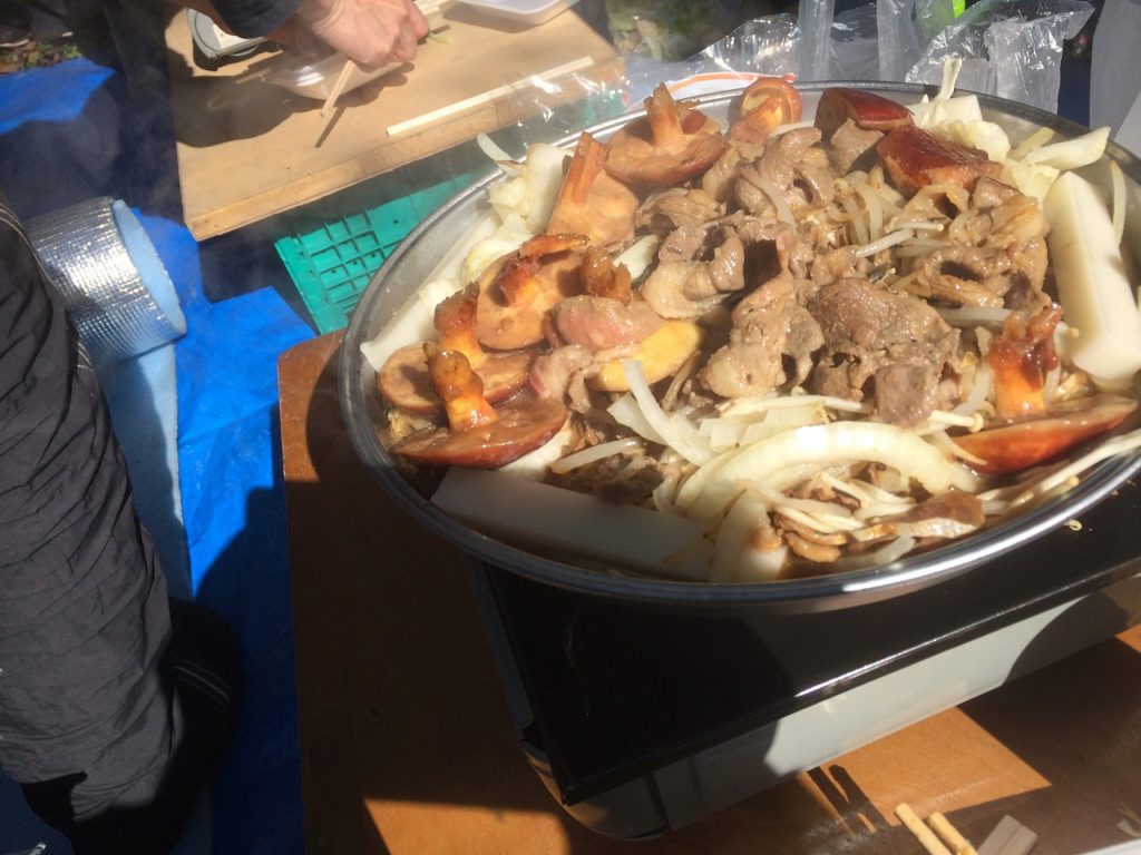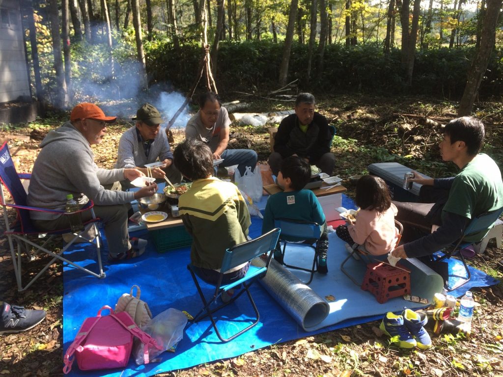 10日にアスリート仲間、その他有志の希望で、先日社員と共に行ったコサインの森へ行きました。まずは、社員で整備した森の中を散策。道の要所要所に様々なキノコが、中でもカラマツ林なので落葉キノコが出ていたので収穫しました。また、見上げたカラマツの木のてっぺん近いところに山ぶどうがぎっしり実っていましたが、登ることも出来ず断念。1時間ほど散策後に、広場で焚火をし小脇にブルーシートを引きジンギスカンを頂きました。ジンギスカンは、初めていただく味噌だれでした。そのジンギスカンに加えて旬の落葉キノコ、ステック状の餅など贅沢な鍋になりました。ちなみに、ジンギスカンは秘伝の味「しのはら肉店」です。次回は、カンジキを履いてジンギスカン?