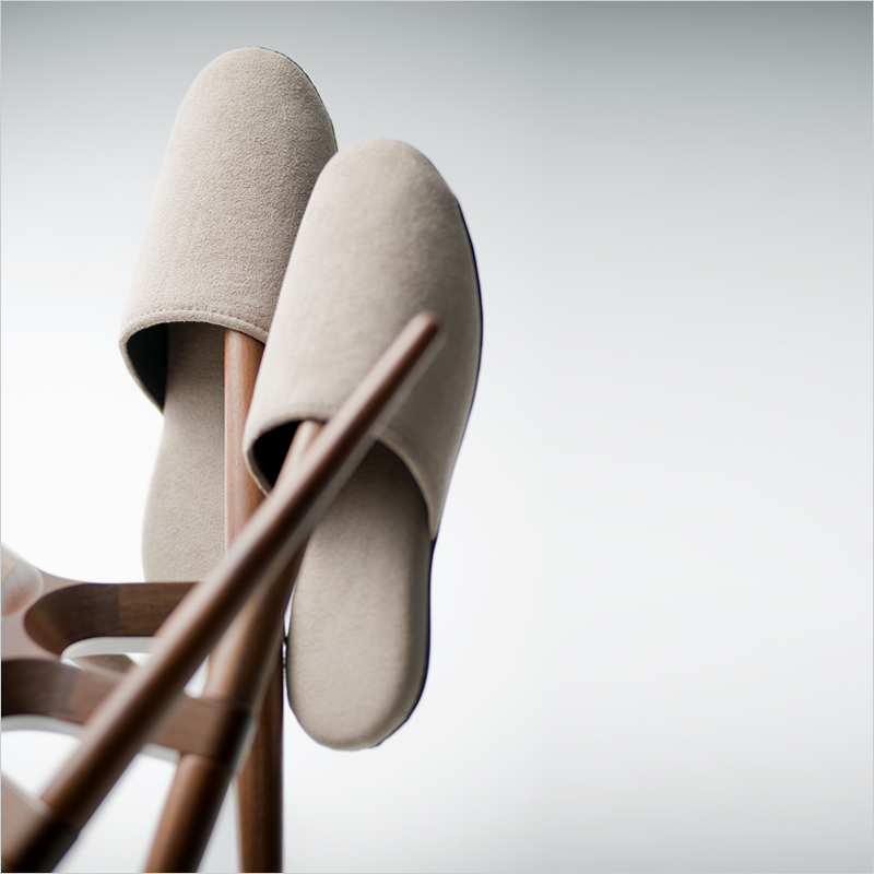 ウォルナット材の上質感を活かしたコサインコレクション。仕上がりの美しさと存在感を追求し、木目・色ともに選び抜いた材料を 繋ぎ合わせました。繊細なフレームラインは熟練のテクニカルハンドワークならでは。スリッパをかけたときに裏面が見えなくなるなど、 使用時の美しさ・実用性も備えています。デザイナーは蛯名紀之氏。弊社の製品開発に創業当時手弁当で関わっていただき今でも、数多くのベストセラー製品が販売されて居ます。蛯名氏のデザインは、造形美が優れていると共に、使い心地の良いところです。