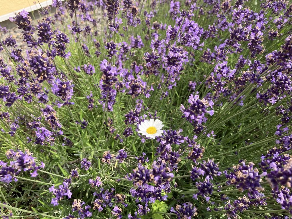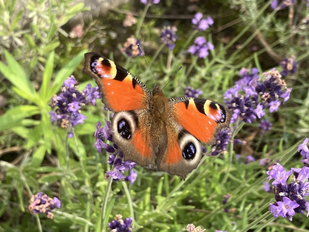 本店の花壇では、ラベンダーが満開を迎え、クジャクチョウが蜜を求めて飛んできています。クジャクチョウは赤褐色の翅に孔雀の羽のような目玉模様が特徴の蝶で、北海道から本州中部に生息します。