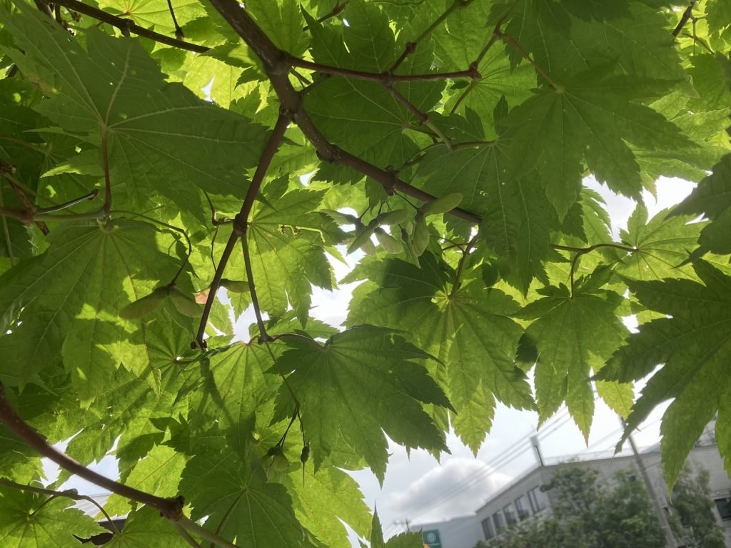 今朝の気温は昨日と変わりませんが、日中は少し暑くなる予報です。工房では、大きな扇風機で風を作り、暑さをしのいでいます。私の居場所の窓の外にはブドウとゴーヤの蔓が日除けとなり、心地よい木陰を作っています。