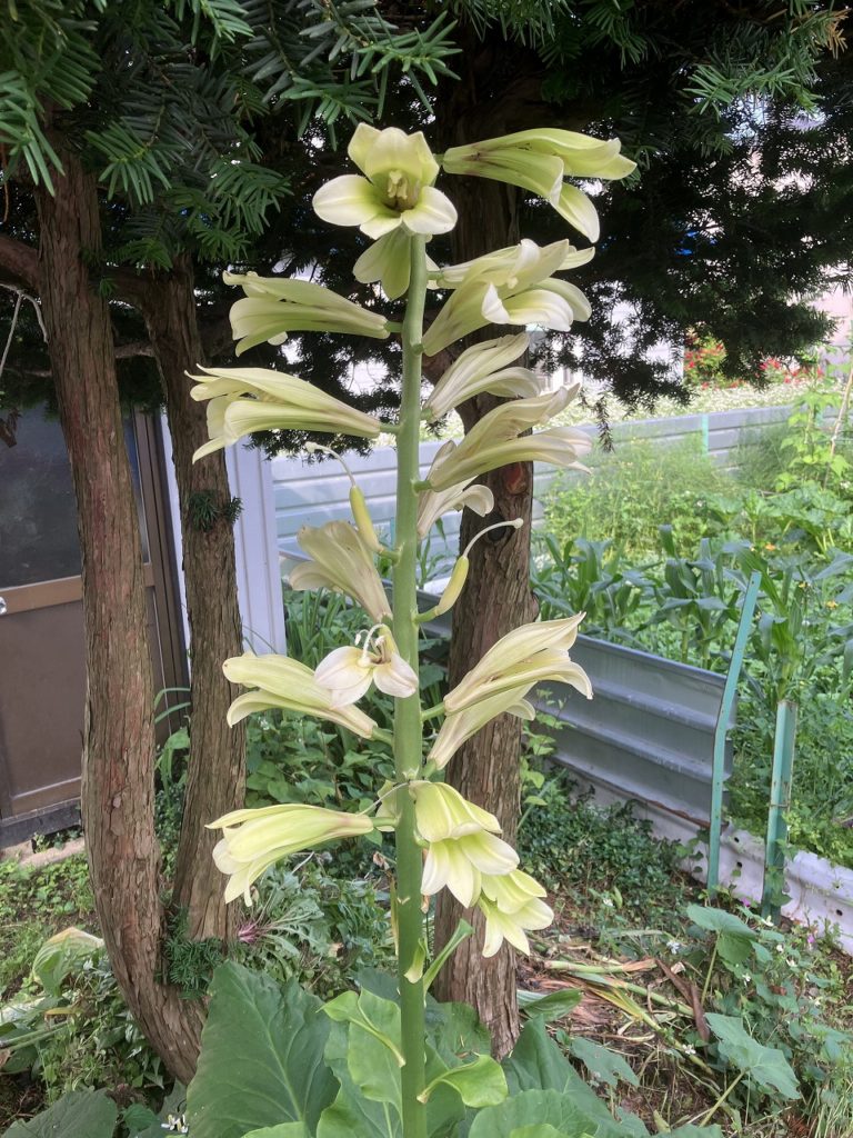 自宅の、オオウバユリが花を咲かせ終え、散り始めました。オオウバユリは北海道や本州北部に自生するユリ科の多年草で、高さ1.5~2メートルに成長し、大きなハート型の葉と香りの強い白い花を持ちます。アイヌ文化では食用や薬用として利用されていましたが、私はそれを知らず毎年刈り取っていました。