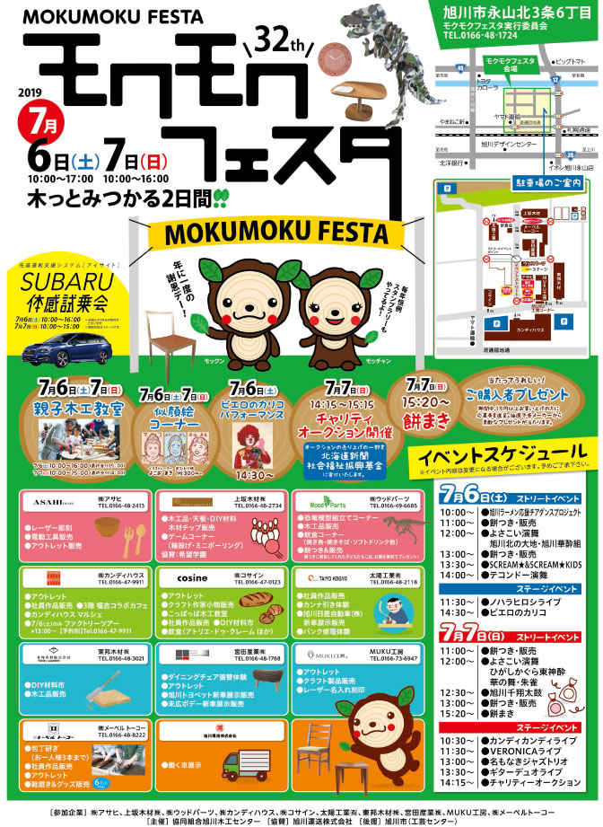一方、今週末の7月6日~7日に、下期第一弾(協)旭川木工センター主催、第32回モクモクフェスタが開催されます。例年3~4千人が来場していただけるイベントとなりました。メイン通りでは様々なお楽しみイベントまた、10社の組合員メーカーが、思い思いに自社の敷地を使ってイベントを行って居ます。団地内は広いので、動きやすい身なりでお越しください。しっかりと、目的を持って来場いただく方も増えて居ます。心配は雨です。