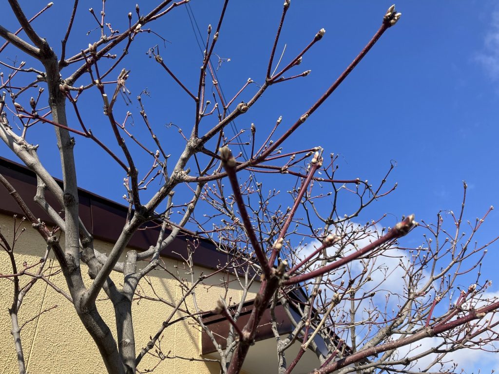 少し冷え込んだ朝、工房の上には青空が広がり、白い雲の中をエアドゥの一番機が旭川空港に向かって飛んでいくのが見えます。時には、白鳥のV字飛行も見ることができ、自然の雄大さに感動します。今朝は氷点下の朝だったので、固雪になって雪山の上を歩くこともできます。しかし、油断するとずっぽりはまってしまうことも(笑)。サクラやイタヤの芽は固い状態ですが、雪解けと共に春の訪れを感じられる日が待ち遠しいです。コサインのある北海道旭川は、春は雪解け水で溢れ、夏は緑に覆われ、秋は紅葉で彩られ、冬は雪景色が広がります。澄んだ空気、静寂、そして雄大な景色は、都会の喧騒を忘れて、心安らぐひとときを与えてくれます。雪崩や吹雪などの自然災害もありますが、それでも春は必ず訪れます。自然の美しさ、力強さ、そして優しさを感じられる雪山の風景は、私たちにとってかけがえのない存在です。