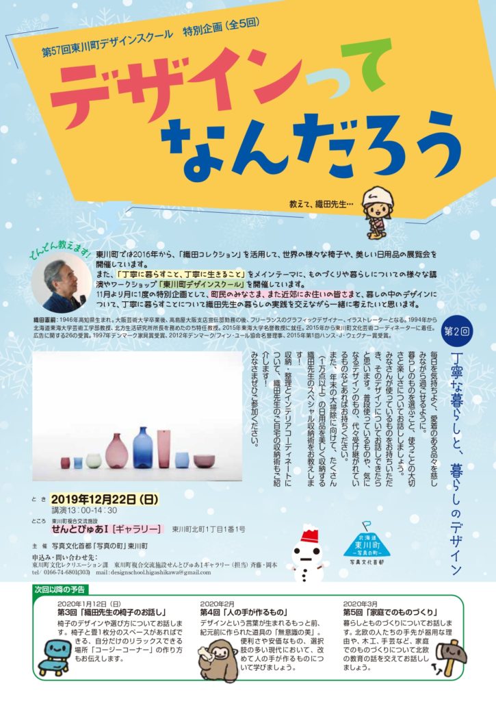 近隣の東川町で「第57回東川町デザインスクール」特別企画(全5回)デザインってなんだろう、第2回「丁寧な暮らしと、暮らしのデザイン」が開催されます。コサインも「コサイン」がある暮らし、 「だんらん」のある暮らし。木のぬくもりには、家族の笑顔が良く似合います。帰りたくなる家づくり。コサインの木の生活道具がお手伝いします。