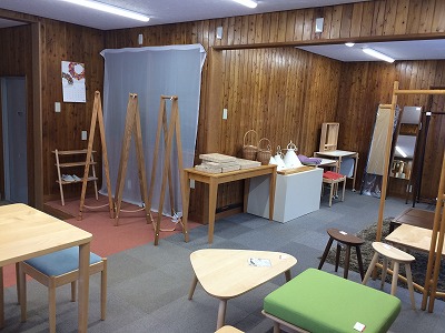 工房に隣接して、アウトレットコーナーがあります。工房を見学していただくことも出来ます。展示していた製品が中心なので、程よく飴色に経年変化した製品もありお買い得です。ショップで展示製品を見てご注文をいただき、お送りしたところこんなに白くはなかったと驚かれる方がいらっしゃいます。