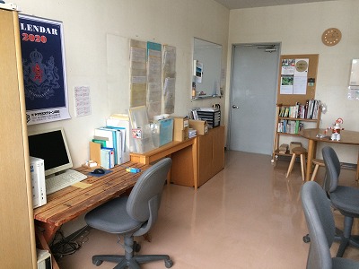 休憩室の壁は北海道産のカラマツ材を使用しています。椅子は旭川家具で、テーブルは自社で製作しました。冬は、備え付けの薪ストーブで暖を取って居ます。