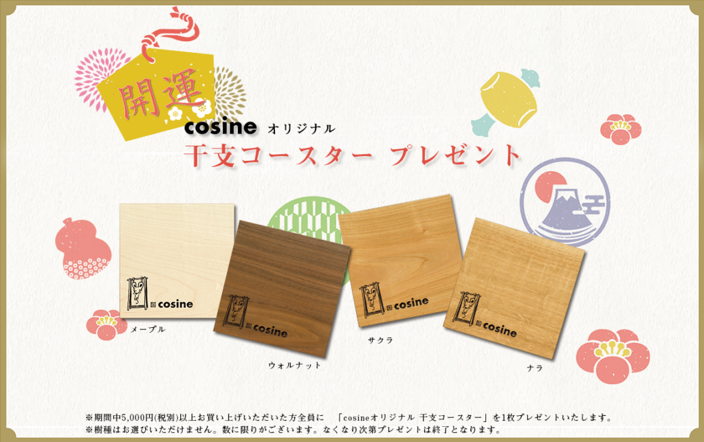現在、コサイン直営店(コサイン旭川本店、コサイン青山、コサイン札幌)とコサイン公式通販サイトそして、一部の販売店にて、2020年の干支 “子” がドレスラックにぶら下がっているイラストをレーザーで刻印した 『 開運』干支コースターをプレゼント中! 数に限りがあります。
