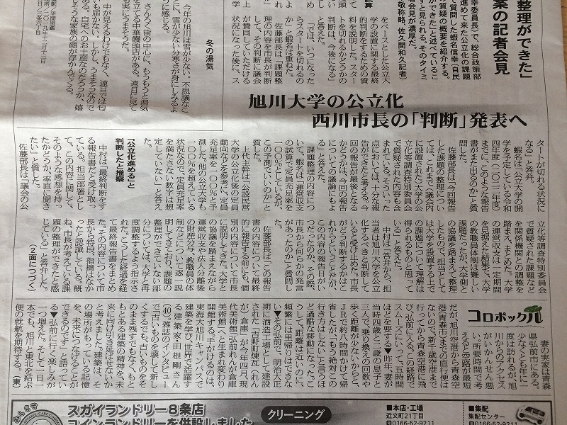 本日、地元紙のあさひかわ新聞に、私立大学である旭川大学校の公立化についての記事が載って居ました。先週末、9年前に結成されたものづくり大学を目指す市民の会の新年交礼会が開催されました。