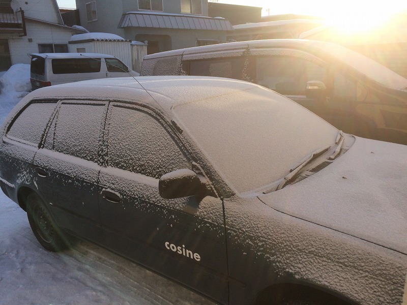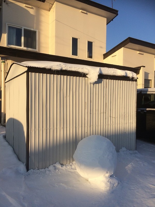 連休明けの今朝は、-11℃と少し冷込み、朝日が雪の粒に反射して居ました。日曜日は大荒れの予報でしたがさもなく過ぎました。そこで、車庫の前に積もった雪を裏に移動しスッキリ。せっかくなので、ゆきだるまでもと思ったのですが、球体を作って見ました。
