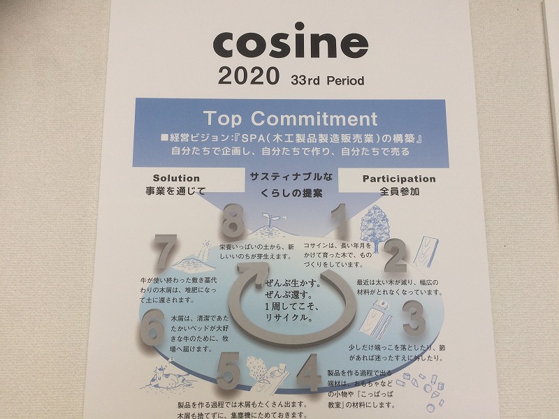 週初めには朝礼を行います。今朝は、2020年度の取り組みについて話をしました。 2020年第33期を迎えましたが、「自分たちで企画し、自分たちで作り、自分たちで売る」」木工製品製造販売業であるSPAを目指しは変わりなく頑張ります。持続可能な暮らし、コサインの家「心地よい、コンパクトな暮らし」をコンセプトに「生活道具」「コサインスタイル」を創り上げる。「ぜんぶ生かす。ぜんぶ還す。1周してこそ、リサイクル。」全員で取り組んで行きます。