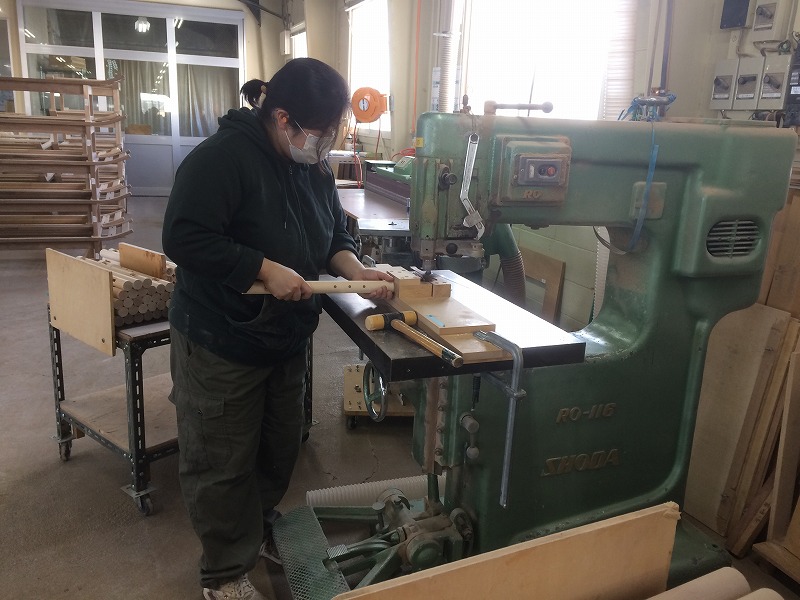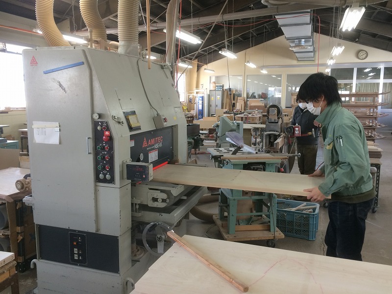 今朝の工房で、天板の表面をワイドベルトサンダーと言う機械で仕上げて居ました。この機械の中に、幅の広い紙やすりのロールが回転して居ます。その下を天板を通す事で、平らに仕上がります。私が職人を目指し就職した昭和45年は、手鉋で仕上げて居ましたね。表面が平らになるように、真っすぐな定規を表面に当てながら1枚を仕上げるのに1時間以上かかって居たと思いますが、今は数分で仕上げる事が出来ます。これが、導入されて時は楽になった一方で、今までの苦労は何だったのかと思いました。常に、木工機械の汎用機を使いそれぞれの製品にあった治具を作り加工しまます。これも楽しみの一つでしたね。職人それぞれの知恵比べです。それは、今も変わりません。いかに均一な品質の製品を作る出せるかは職人の知恵と技です。