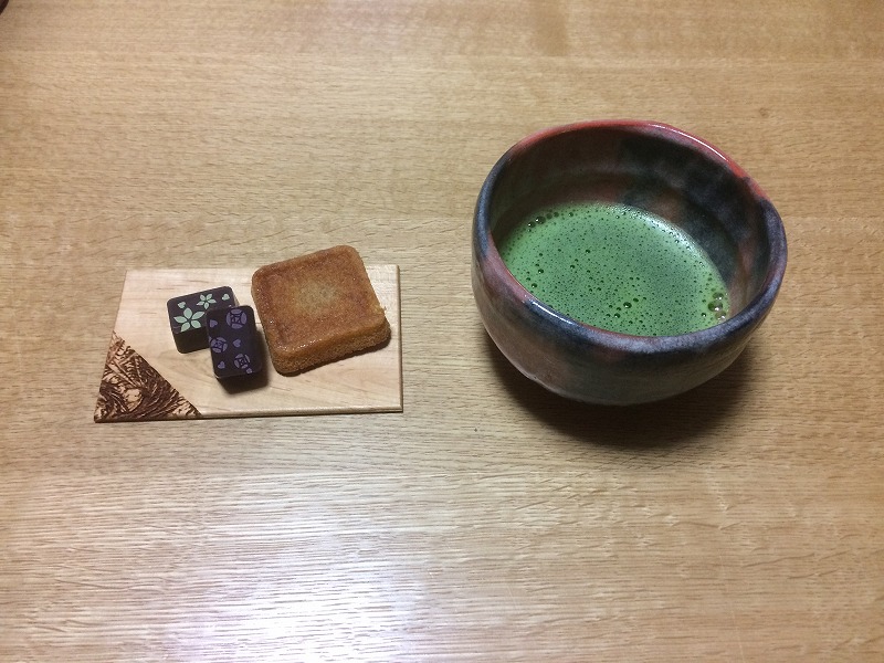 土日、ゆっくりとは行きませんでしたが、過ごす事が出来ました。妻にいただいたホワイトデーの贈り物がありましたので、お茶をたてて頂きました。お菓子を乗せたプレートも木っ端で作りました。