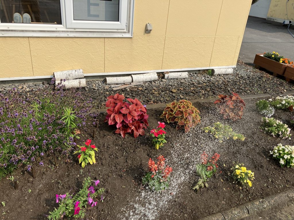 コサインの駐車場側に広がる花壇は、ガーデニングが好きな社員たちの愛情と手間が詰まった特別な場所です。そこには、17種類もの美しい草花が季節ごとに彩りを添えています。