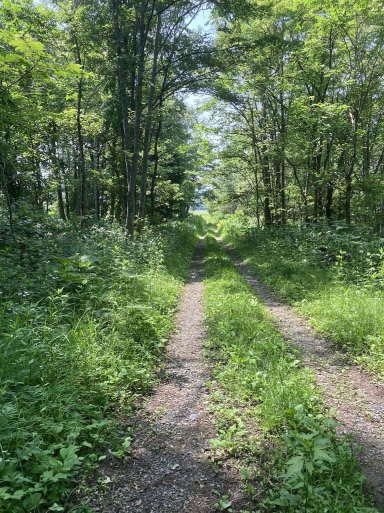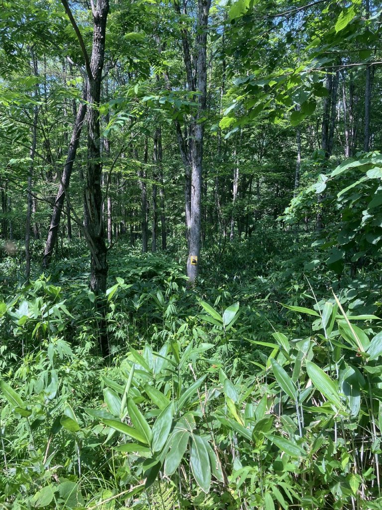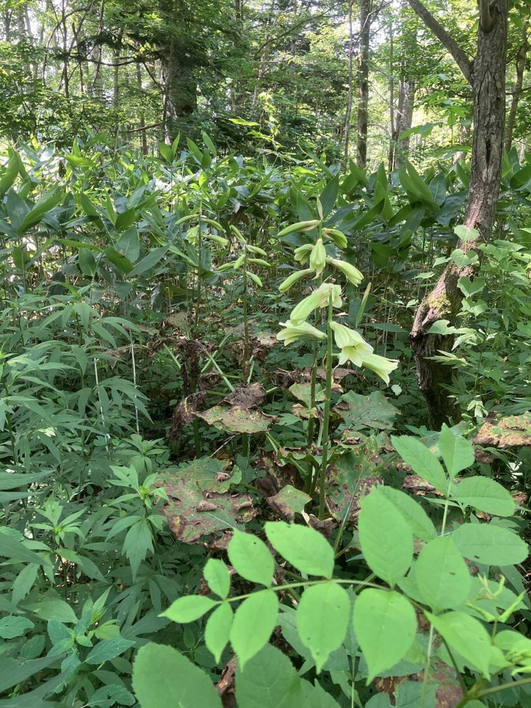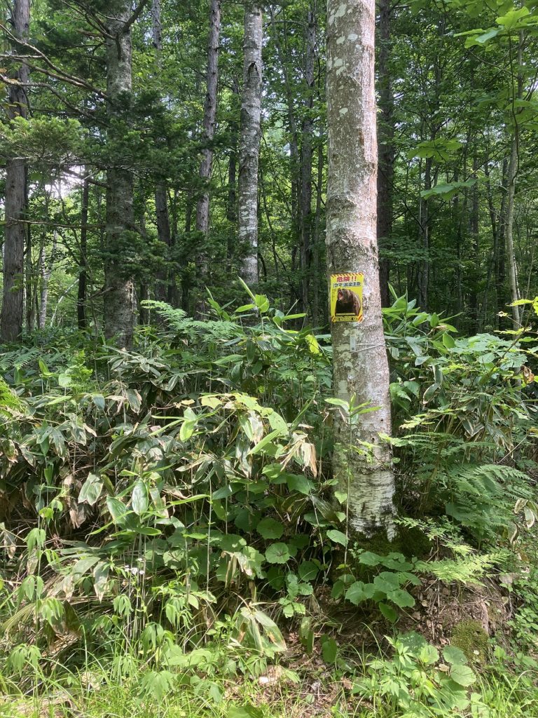 先日、15日にコサインの森に出かけてきました。白樺の樹液を採取した春の雪が残る時期以来の訪問でしたが、すっかり様子が変わり、一面に草が生い茂っていました。今回の訪問の目的は、一般の方が森に入られる際に注意を促すための熊のパネルを設置することでした。熊に限らず、野生動物は山々を連なって移動するため、コサインの森も通り道になっています。数年前から自宅の庭に育っている大きな葉。通常なら刈り取ってしまうのですが、今年はそのまま様子を見ていたところ、オオウバユリであることがわかりました。コサインの森でも、種が付いたところを見かけた気がし、広場の周りを見るとたくさんありました。