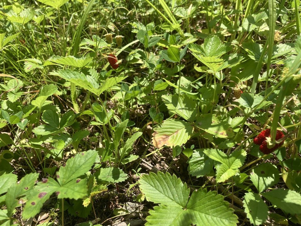 他には、桑の木が実を付けていました。子供の頃、桑の実を食べて口の中が紫になったことを思い出します。林道わきにはヘビイチゴが実っていました。なぜ「ヘビイチゴ」と呼ばれるかと言えば、実が食用にならず、ヘビが食べるイチゴや、ヘビがいそうな場所に生育することから諸説あるようです。実際に食べてみましたが、イチゴの味がしました(笑)。