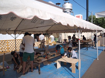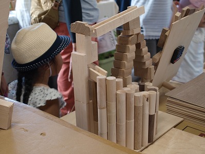 中でも一番好評なイベントが親子木工教室。1組500円で作り放題。すっかりお馴染みの方もいらしてくれます。さらにスケッチや図面を書いて来る方も居てプロを脅かさないでと、声を掛けたりしています。10社から端材を提供し、希望のサイズに切ったり、穴を開けてくれたりを職人が応援してくれます。夏休みの自由研究としても人気です。参加費の一部を寄付させていただいて居ます。今年はどんな作品が出来上がりますか楽しみ、楽しみ。