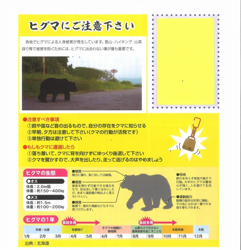 昨日、株式会社コサインが加盟している旭川市森林組合の広報誌が届きました。私たちコサインは、東京ドーム1個分に相当する4,700㎡の森林(コサインの森)を所有しており、その保全活動の一環として森林組合に加盟しています。広報誌の中には「ヒグマにご注意」という特集がありました。山々は繋がっており、私たちのコサインの森もヒグマの通り道になっているかもしれません。そのため、注意事項を守りながら森林浴を楽しむことが大切です。ヒグマに遭遇しないためには、音を立てることや食べ物を持ち歩かないことなどの基本的な注意事項を守り、自然との共生を心がけています。