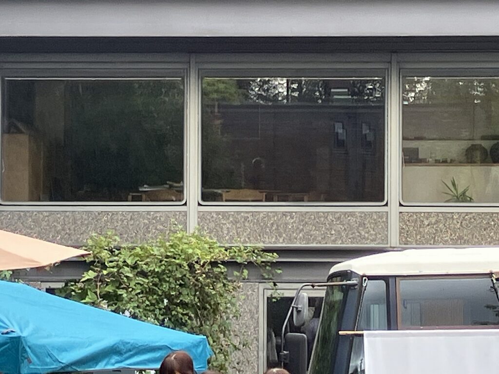 ふと、会場から見上げた事務所の2階に、見覚えのある椅子の背もたれが…!