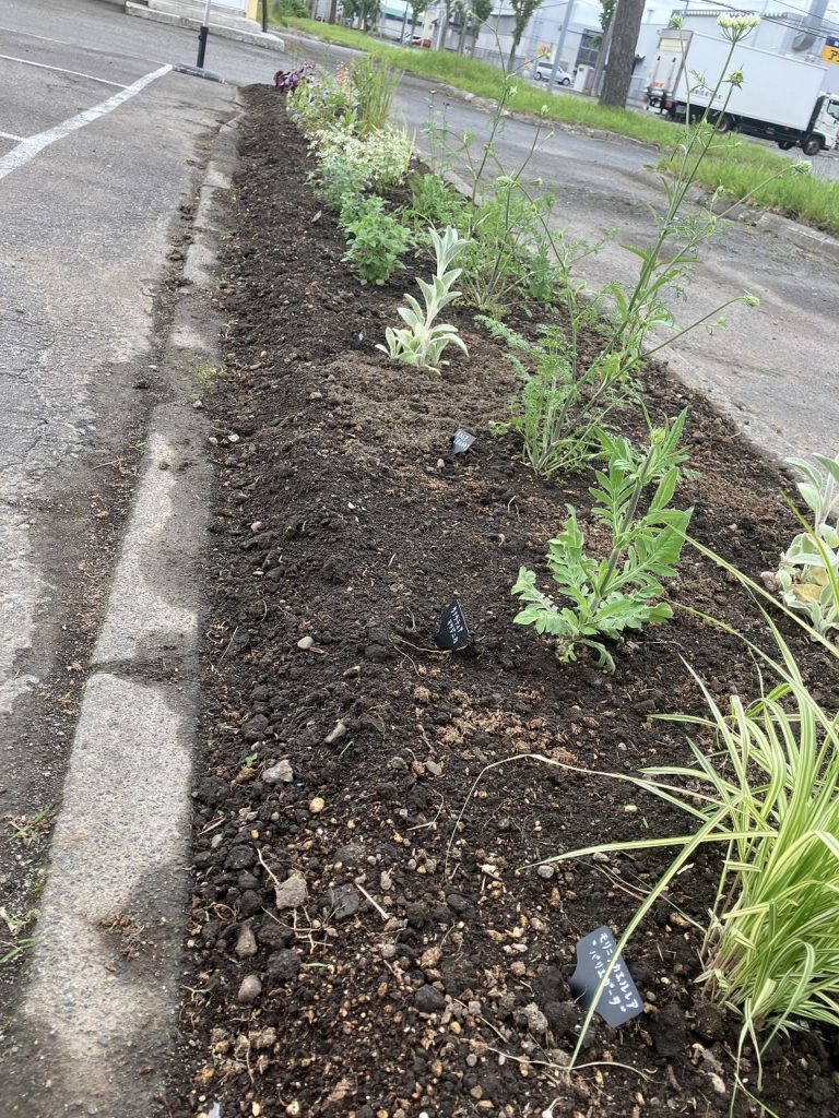 お客様駐車場側の花壇には、ガーデニングが好きな社員の手で育てられた17種類の草花が彩りを添えています。それぞれの花には名前が添えられており、訪れる皆さまにも分かりやすいよう工夫されています。