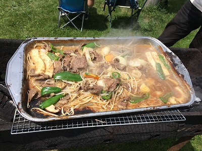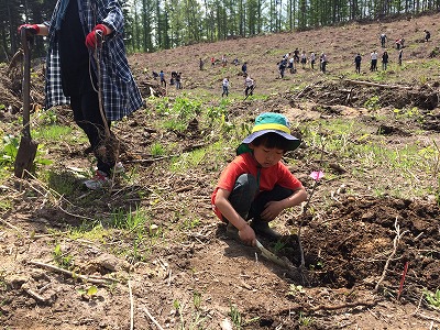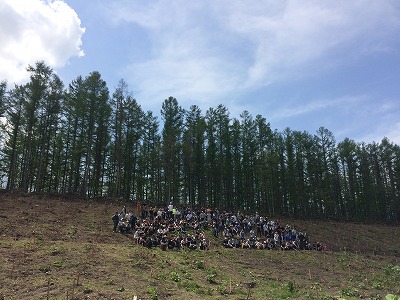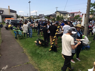19日の日曜日、旭川家具工業協同組合主催の植樹祭が開催されました。27℃の予報がでる暑い日に300名が参加し、5千本近いミズナラの苗木を植林しました。穴を堀り苗を入れ土で踏み固め、鹿避けに添え木を立てて行きます。私は、何時も穴を掘る役で、その後を苗を植林してくれます。一汗かいた後は、みんなお楽しみのジンギスカンです。何時もは、ガスにジンギスカン鍋でしたが、今年は炭火にトレーだったので、焼くと言うより煮込むと言った感じです。昨年同様ステック状の餅を持て行き美味しく頂きました。合わせて、今年は七味唐辛子を付けていただきましたが、これがまたおいしいんです。お試しください。