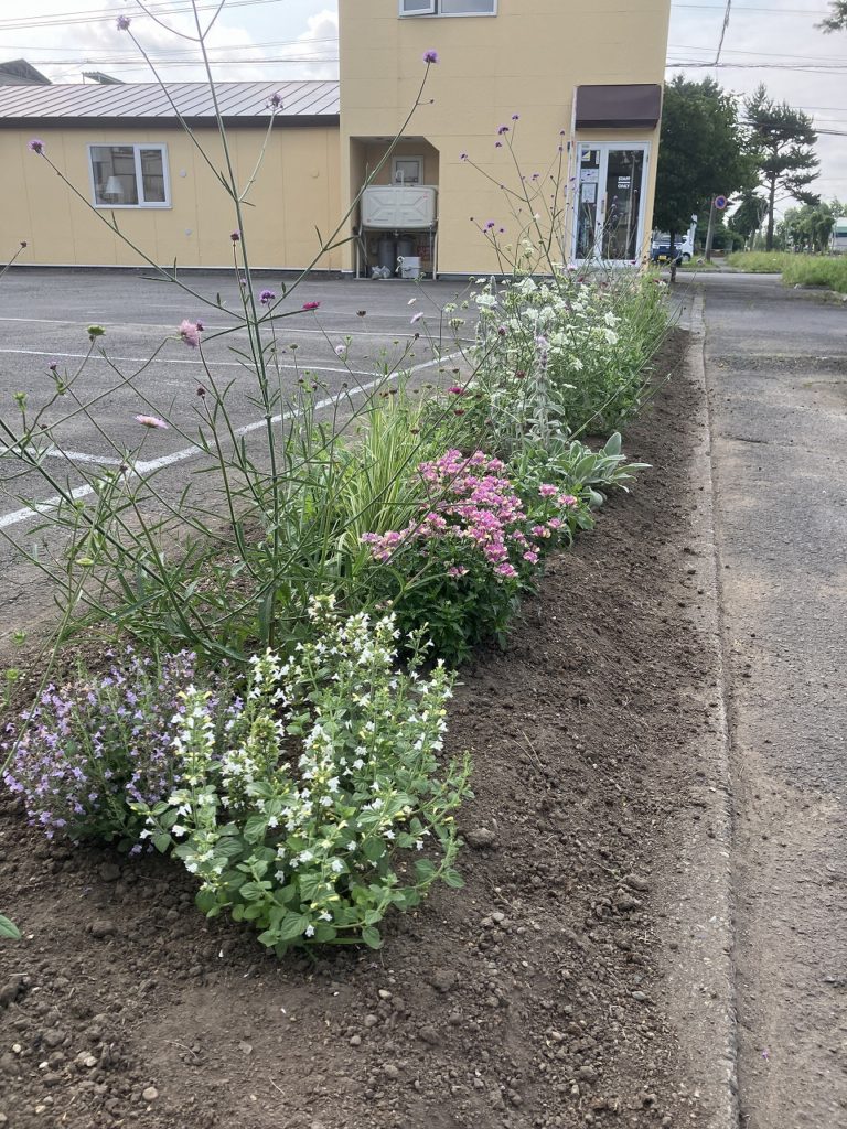 コサインの駐車場側に広がる花壇は、ガーデニングが好きな社員たちの愛情と手間が詰まった特別な場所です。そこには、17種類もの美しい草花が季節ごとに彩りを添えています。
