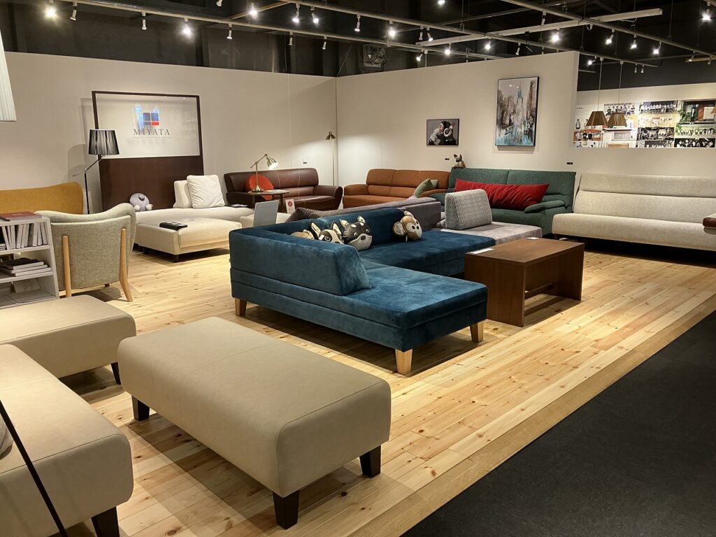 宮田産業さんのブースは、くつろぎの時間そのものを体感できる展示です。