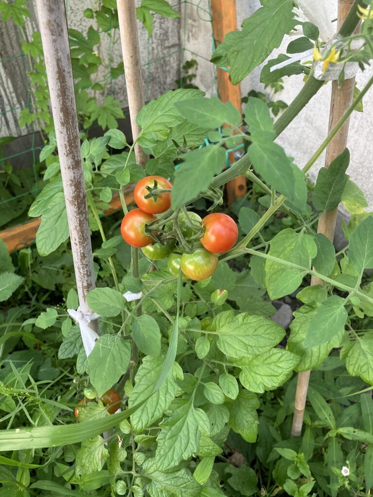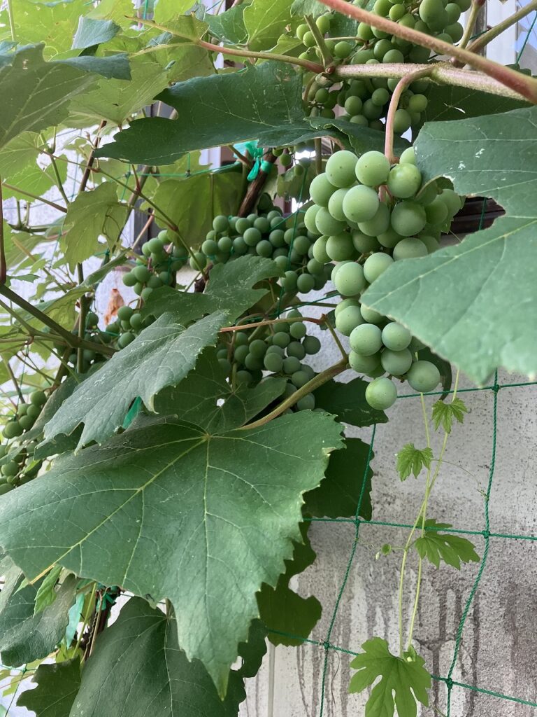 日除けとして育てているブドウとゴーヤのつるがしっかりと役目を果たし、