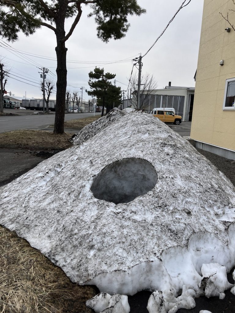 工房の脇に残る雪には大きな穴がぽっかり…。