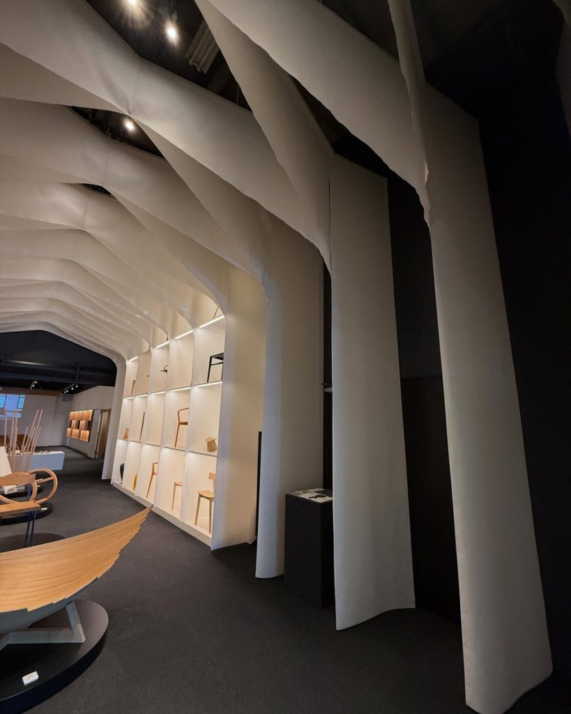 白くしなやかなその素材は、天井から床に向けて柔らかく下がり、空調の風でふわりと揺れて、展示に静かな動きを添える…そんな意図が込められていたのだそうです。