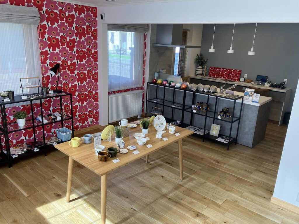 スウェーデンハウスの常設展示がある販売事務所は、北欧ブランド マリメッコ の壁紙が印象的に使われた、とても素敵な空間。訪れるだけで心が躍るような時間を過ごせます💐