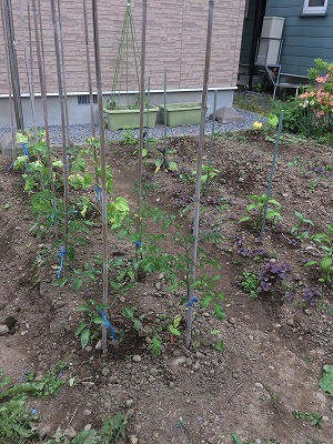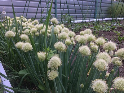 一方の自宅では、寒さ除けのビニールを外した野菜が天に向って成長して居ます。長ネギの頭は花が咲き実(種)を付けて居ます。また、サクランボの木も実が色付いて来ました。