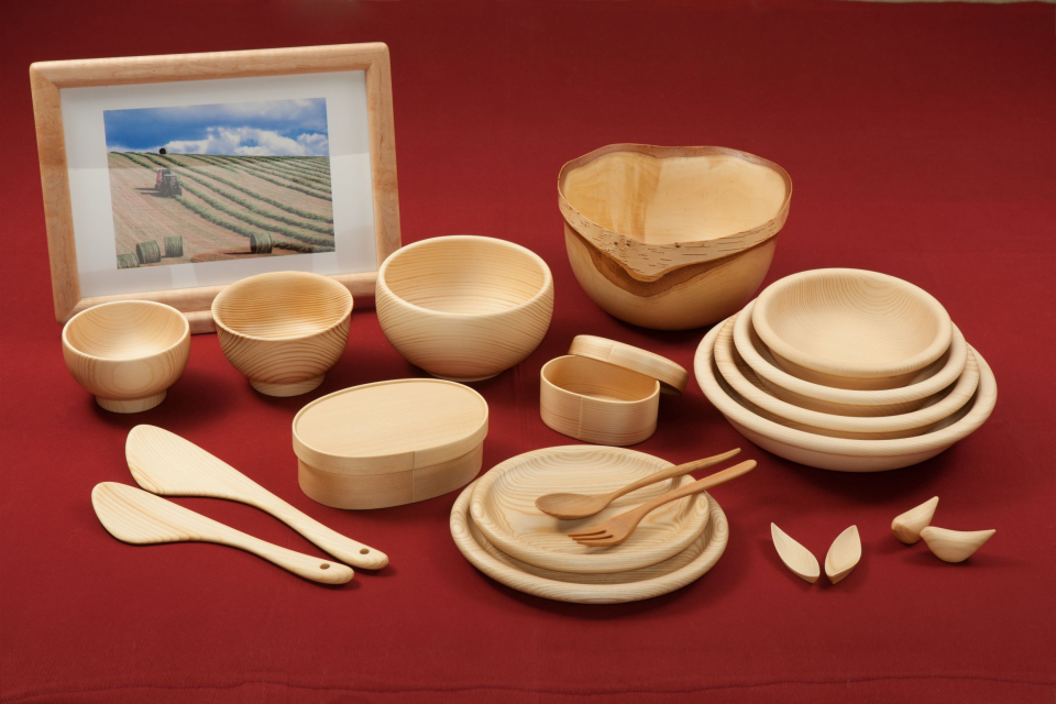 オケクラフトは、置戸町の「オケ」、昔から地域産業として生産されていた曲げ桶の「オケ」と、「クラフト」を合わせた地域クラフトブランドであり登録商標です。日本の著名な工業デザイナーとして活躍された故秋岡芳夫氏が名付け親で、「北国からの新たな生活文化の発信」というグランドデザインから1983年に誕生しました。今年で37年目を迎えています。使われる樹種は、エゾマツのほか、センやカバ等の約20種類で道産材。器やカトラリー等、数多くの暮らしの道具を、町内に工房を構える「作り手」が製作しています。