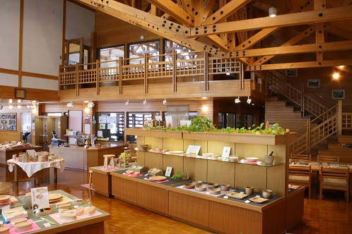 オケクラフトセンター森林工芸館ショップでは、北海道置戸町の地域クラフトブランドであるオケクラフトを展示販売しています。店内には、椀やボウル、皿、スプーン、フォーク、炒めへらなど手づくりされた製品が生産する工房ごとに並べられています。