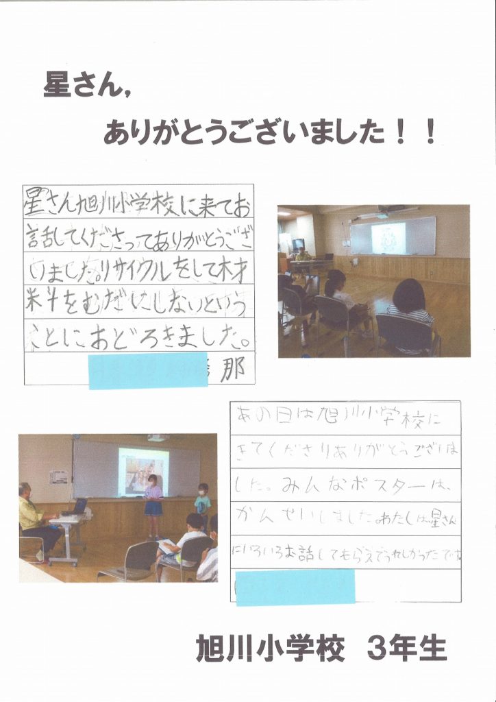 昨日から、暑い炎天下の中コサインに隣接する緑地帯の雑草刈りが行わています。刈られた上でごろりとしたいところです。でも、あっという間に伸びて来るのでイタチごっこでになります。自宅で妻も苦戦奮闘してます。先日、近隣の小学校3年生の社会科で、旭川家具をテーマに学び、応援ポスターを制作する授業がありました。そこにゲストとしてよばれ、53名の3年生に旭川家具の話をさせて頂きましたが、そのお礼のお手紙が届きました。皆、真剣に聞き入ってくれ、メモを沢山取っていました。ポスターは完成したそうです。是非、旭川家具デザインセンターに掲示してはと双方に伝えています。子供たちに応援していただいているなって感謝ですし、ポスターを見るのが楽しみです。ちなみに3枚目の写真は、木工旋盤で削た時に出た削り屑です。woodchipsですが、食べる事は出来ません。(笑)
