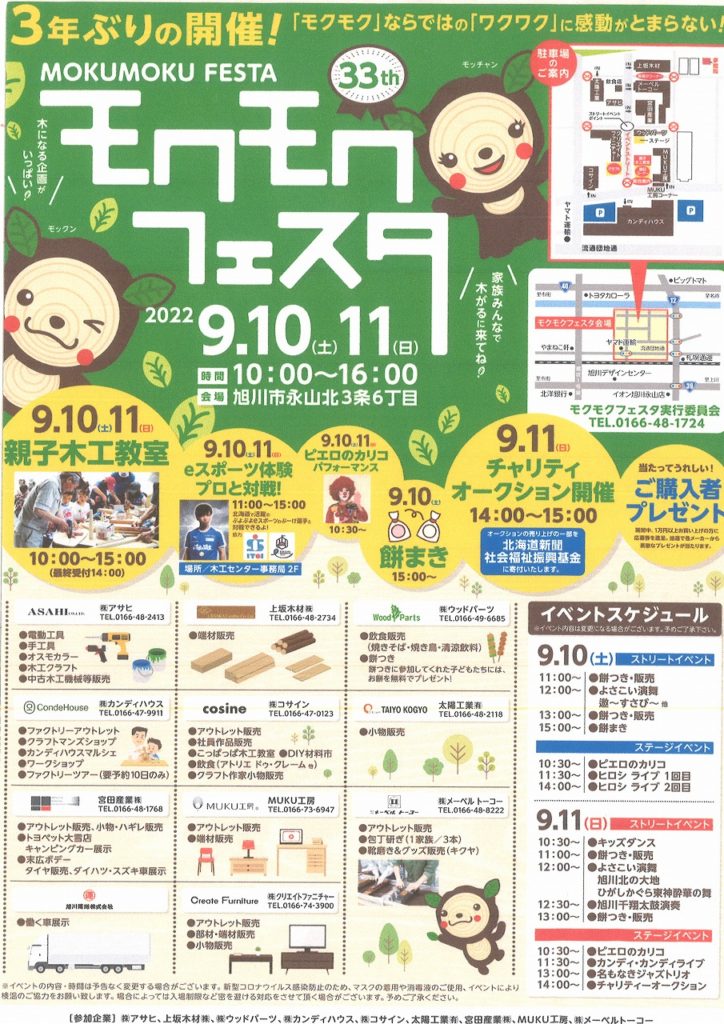 9月のスタートは、今にも雨が降りそうな空模様です。つゆ草や秋の花々が、いたるところに見受けられます。ぶどうも色付いて来ました。冬の準備も気になる時期になります。㈿旭川木工センターにて3年ぶりに開催されるモクモクフェスタ。2日間で5,000人来て頂いていたイベントでしたが、コロナ禍の中まったく予測がつきません。しっかりと新型ウイルス対策を取り楽しんでいただきたいと思います。社内でも、仕事を終えた後に作りたがりの社員が、製品を作る際に出る端材を生かして、自作の作品を作っています。モクモクフェスタの際に「作りたがり屋」コーナーを設けて販売します。