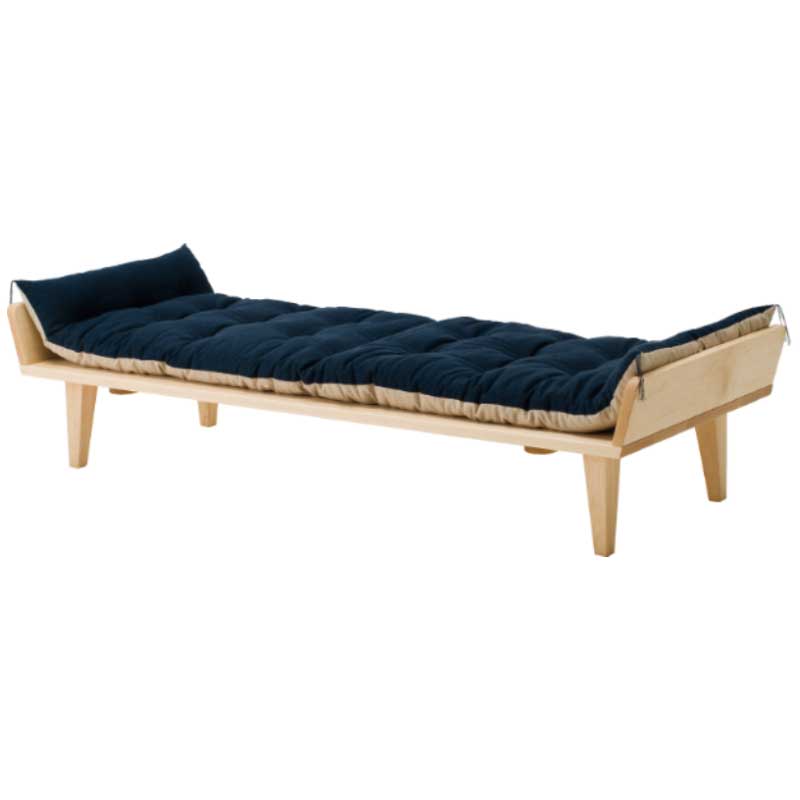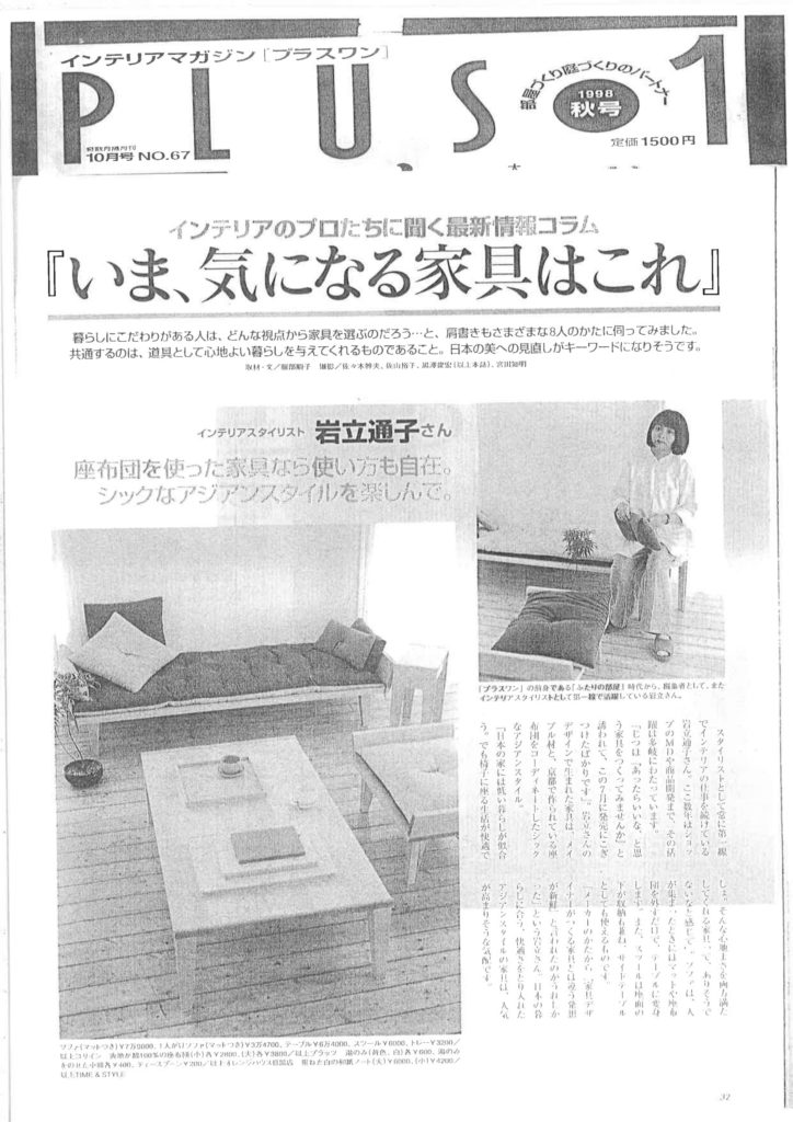 今朝、工房でウォルナット材で製作した「お昼寝ソファ」を見かけました。プロパー製品はメープル材で製作しています。本体は4枚の材料を接着しています。このお昼寝ソファは、1998年インテリア雑貨スタイリストの先駆け、岩立通子さんとの出会いから商品化されたものです。「日本の家には低い暮らしが似合う。でも、椅子に座る生活が快適しょ。そんな心地良さを両方満たしてくれる家具ってありそうでないと感じて」。ソファは、人が集まった時は、マットや座布団を外すだけで、テーブルに変身します。一緒に一人掛の「ちょっとソファ」センターテーブル、座面の下が収納も兼ね、サイドテーブルとしても使えるスツール、お月見トレーも同時に発表しました。マットは、岩立さんとのご縁で京都のプラッツさんに製作していただいており、今も他の製品の座布団もお願いしています。現在、お昼寝ソファ以外は生産を終了していますが、実はお昼寝ソファも一度生産を終了しました。2010年に、お取引していますWebショップの企画で、岩立さんの愛弟子の方のお陰で、高さを修正し再デビューし、現在も製作しています。岩立さんは2001年にご病気で亡くなりましたが、抜群のセンスをもつ職人タイプの、厳しくしかし真摯に仕事に立ち向かう姿のスタイリストでした。