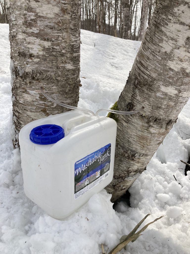 毎朝、サクラの蕾を観察していますが、今にも開花しそうです。コサインの敷地内には3本の桜と1本の楓の木があります。桜の蕾を見ると1本が薄いピンク色していて種類が違うようです。花壇の整備も始めました。 22日、コサインの森へ白樺の樹液を採取に行って見ました。3月にスノーシューを楽しみに行った時とは雪が融け一変し、木が倒れて道をふさいでいました。まずは、道路の整備から始め白樺に設置して来ました。23日午後から行って見ると、2本の白樺から20Lmのポリタンク一杯採取することができました。さっそくコーヒーを入れて飲んでみましたがほのかに甘さが伝わり美味しくいただけました。