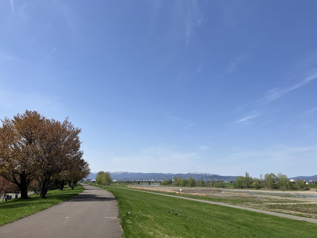 今日は、暖かくなる予報で、心地よい春風が吹いています。弊社が位置する工業団地(協)旭川木工センターに隣接して、一級河川である石狩川が流れています。その堤防沿いをラニングコースにしています。昨年護岸工事が行われ整備されました。今年はこの広い場所をモクモクフェスタ開催の際に駐車場として使わせていただく予定でいます。堤防沿いには桜がありますが今は、白いサクランボの花が咲いています。