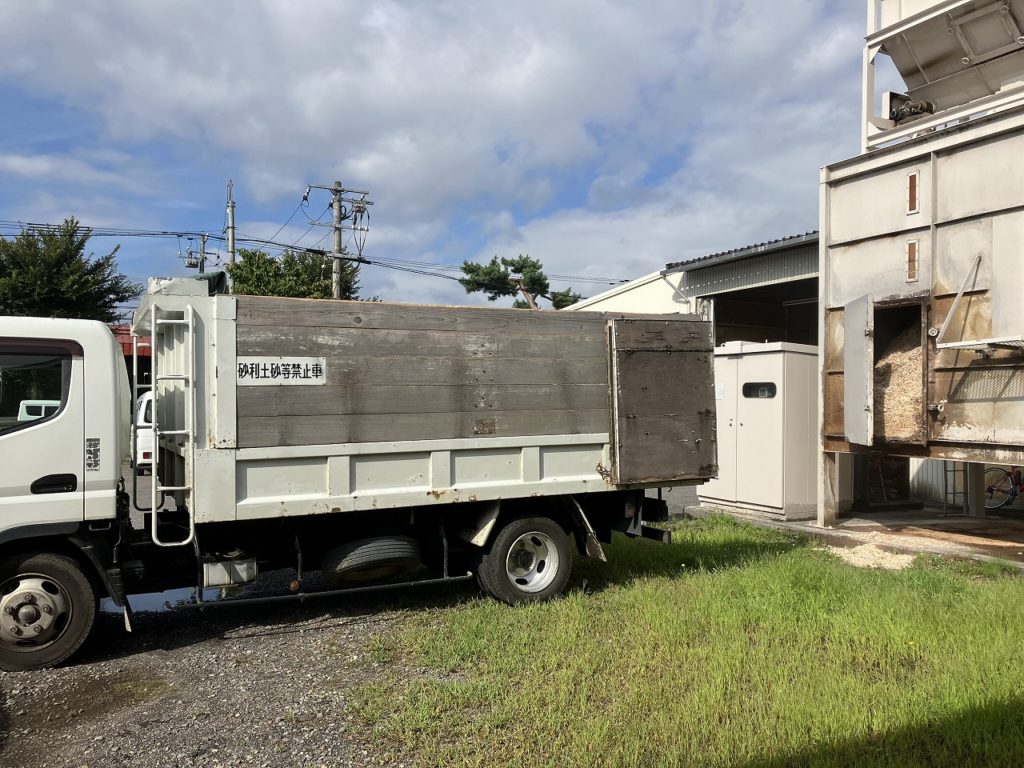本日も暑い一日が予報されていますが、明日はさらに。そんな中、工房で出たカッターくずを回収に来てくれています。カッターくずが入っている建屋からトラックに移す作業は大変なんです。細かいくずなので、フード付きの作業着を着、スキーのゴーグルを付けて、雪かきの道具で移して行きます。特に夏場はサウナの中で作業をしているようなものです。回収したカッターくずは、農場に運ばれ牛舎の敷き藁の代用として使用されます。使用された敷き藁はさらに回収され処理場に運ばれ、最終肥料となり農家等で使用されます。これが、コサインが目指す「ぐるりさいくる」です。