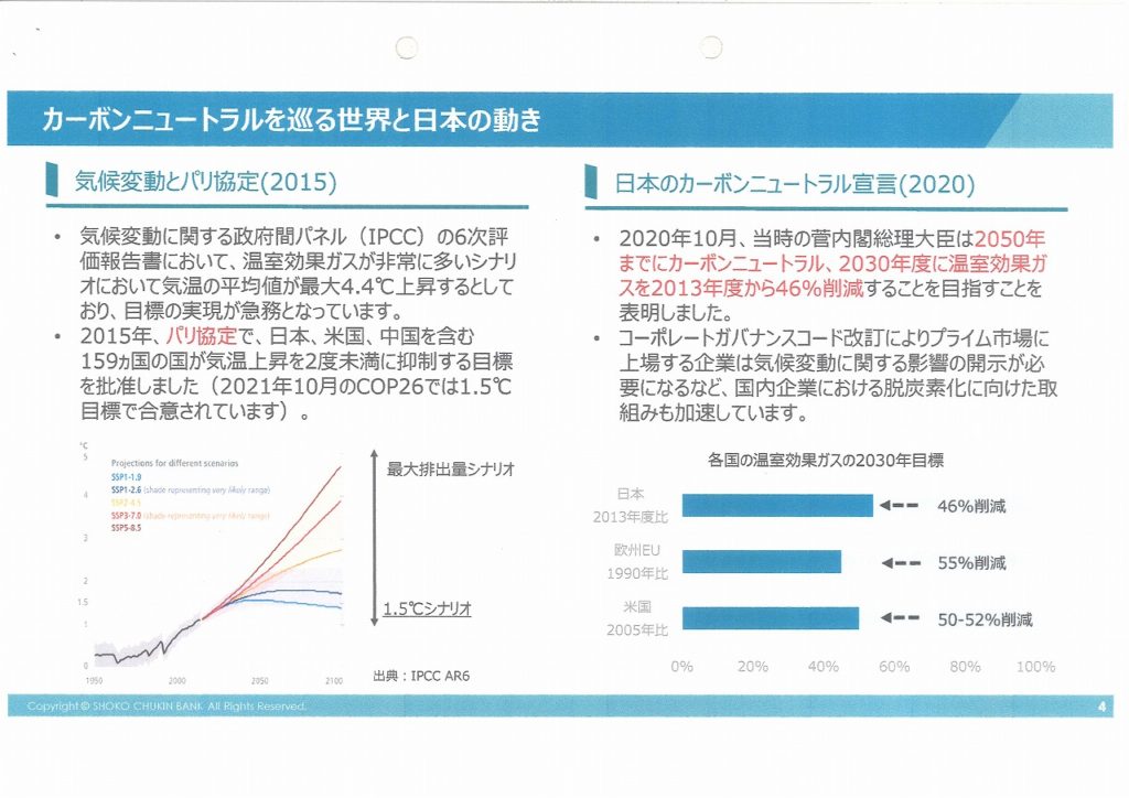 協同組合旭川木工センターの月例理事会で、ランチミーテングを行っています。その際に、様々な方に話題提供をお願いし学びと情報交換を行っています。今回は、商工中金さんにお願いし、「脱炭素経営」について学びました。パリ協定や日本のカーボンニュートラル宣言されていますが、自分たちはどのように置き換えて取り組んで良いか、わかりずらいところです。
