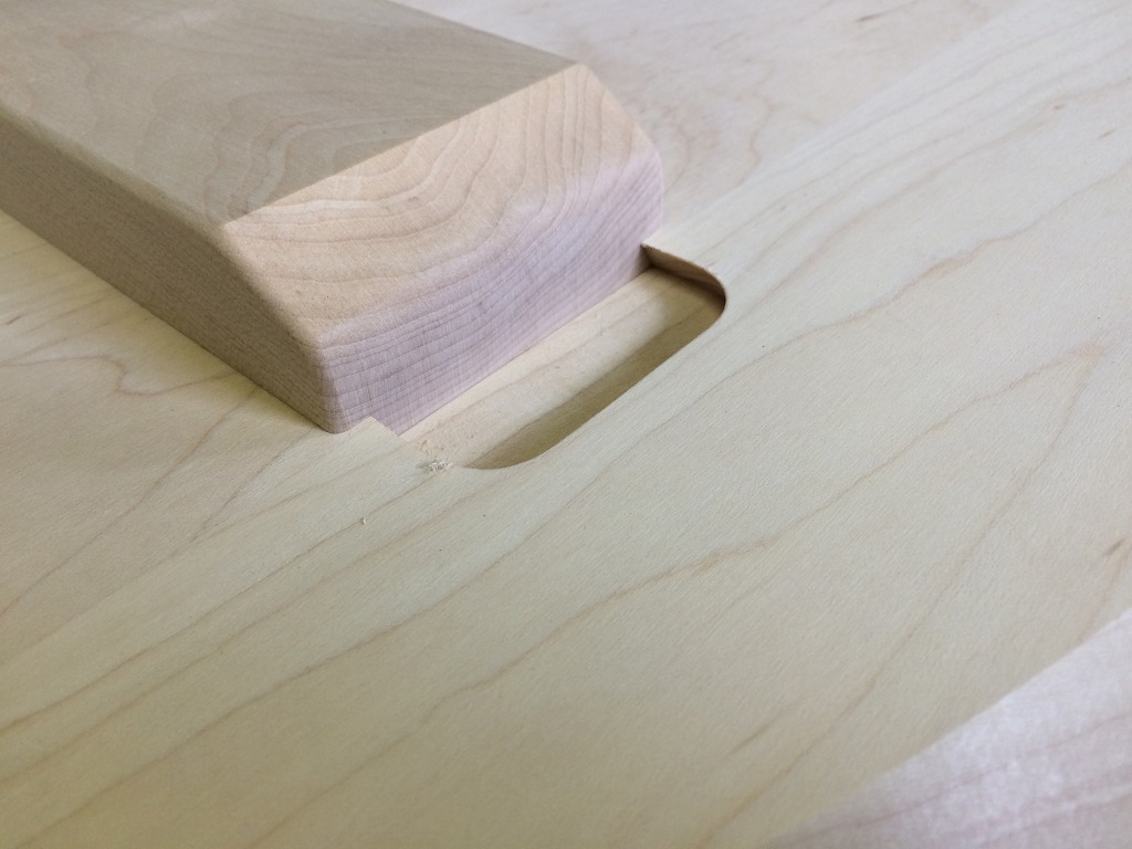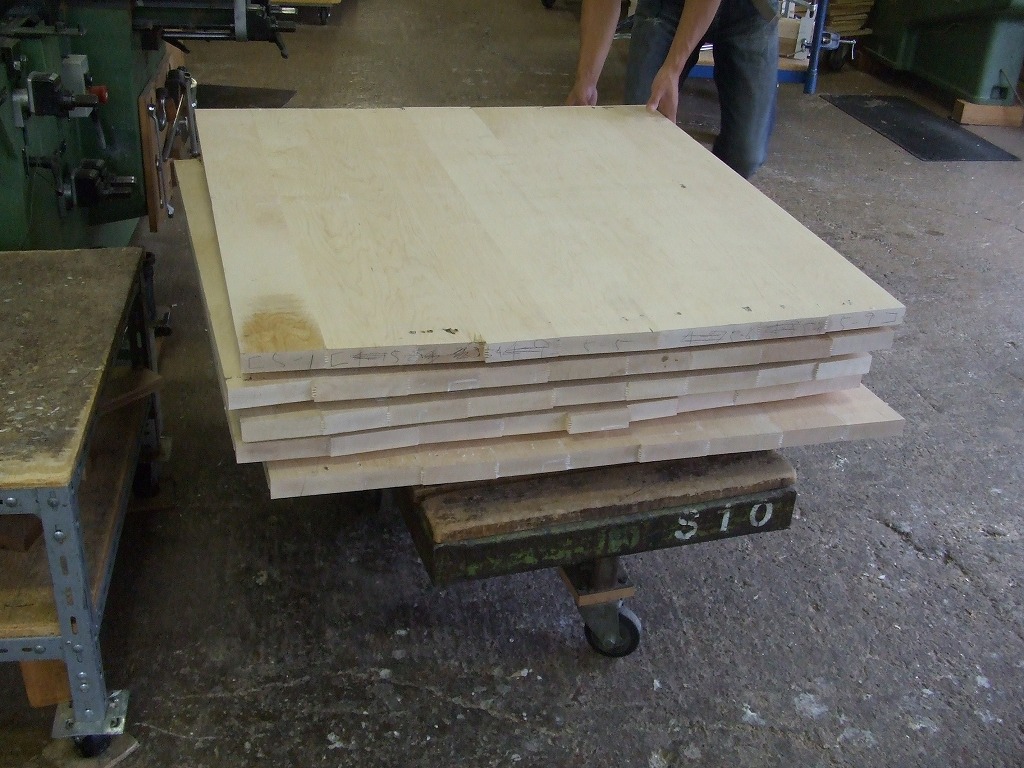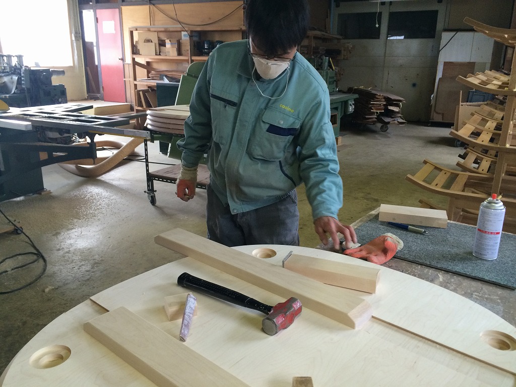 950×950サイズの天板を製作するために8~10枚の板を接ぎ合せます。それぞれ木目、色が違うので心地よいバランスの取れた板を接ぎ合せます。そのためには必要以上に板を用意し合わせています。接ぎ合せ専用の刃物で加工し締め金具で固定します。1枚にでき上った天板の両面を平滑に仕上げ、周りを楕円形に加工します。次に天板の裏面に反り止め加工を行います。様々な手法があります。貫材をき材をべた付けし木ねじで止める方法、鉄を用いて木ねじで止める方法等がありますが、コサインでは木ねじ、接着剤は一切使わず天板に角度の付いた溝を掘り、それに合わせた貫材を入れます。貫材の奥に行くほど締まるように加工されています。木材は温度湿度に敏感なので収縮します。それを反り止めが受け止めてくれます。緩んだ場合は奥に反り止めを押し込むことで反りを防いでくれます。長く大切に使っていただくために製品ごとに取り組んでいます。100年使っていただければ、100年木を切らずに済みます。