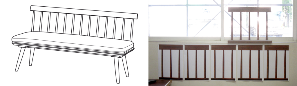 【森】 リーテソファ(生産終了)のスポークの形を決める時、太くはしたくないが折れてしまうという状況でしたが、試験を繰り返すと根元の方が太ければ上の方は細くても大丈夫で、それぞれ何ミリと分かってきました。そこで間のつなぎ方を何パターンかCGで出して原寸に印刷して比べ、一番スッキリ見えるものを選びました。